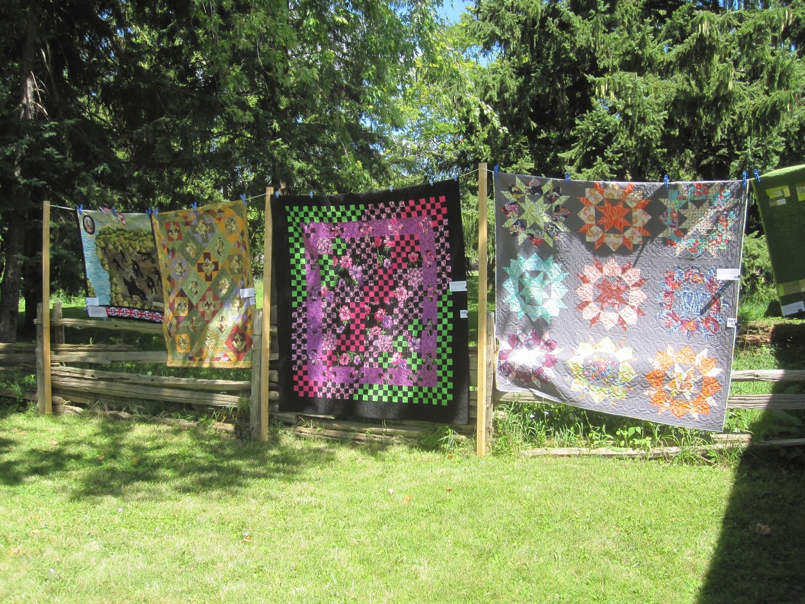 Well, now that it's over, I can show you some of the great quilts that were hung at Pioneer Village in Toronto this past weekend - Quilts at the Creek. The weather was great for both days. There was a trunk show each day by two different quilters and there was also a vendors area. Included in this year's viewing was a quilt set up on a frame with a few ladies demonstrating hand quilting. As I walked around, the comments were quite favourable. Hopefully, it generated enough interest in some people to begin quilting.